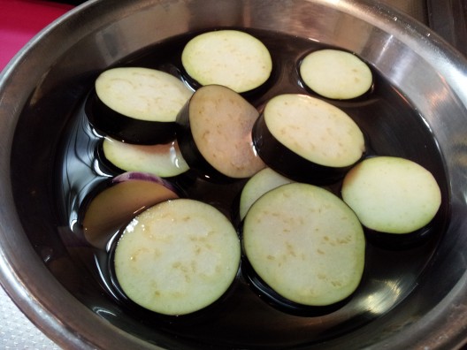 茄子はへたをおとして、1cmくらいの厚さに輪切りします。