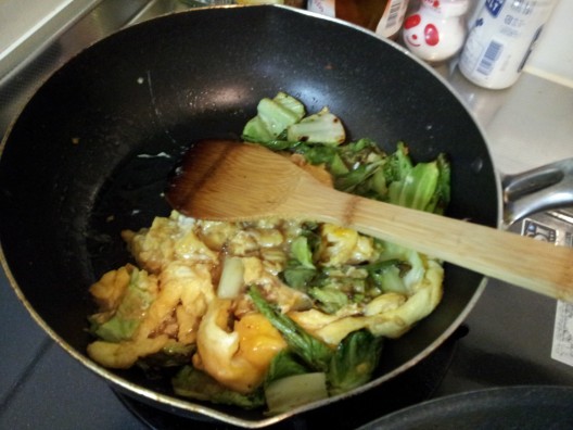 キャベツに火が通ったら、出しておいたふわふわ卵をフライパンに戻します。